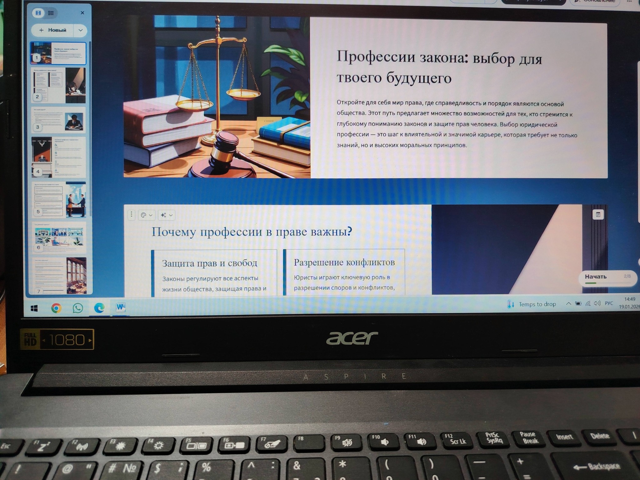 19.01.2026г. в рамках месячника "Закон и порядок" педагогом- профориентатором было проведено мероприятие "Профессии закона". Цель мероприятия: помочь учащимся осознанно выбрать юридические или смежные профессии, сформировать понимание их роли, требований